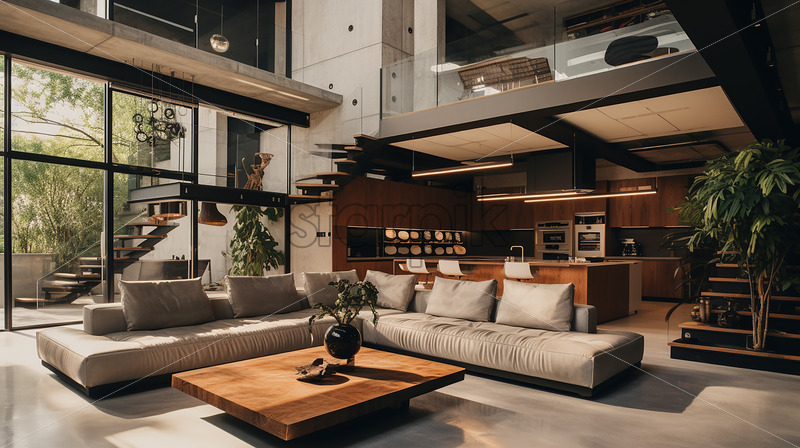 Modern house in the city , clear glass wall and cozy lounge and kitchen with classy stair, an elegant ambience with cinematic theme and indoor plants