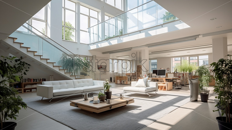 Modern house in the city , clear glass wall on the second floor, cozy lounge and book shelves with classy stair, an elegant ambience with white theme and indoor plants