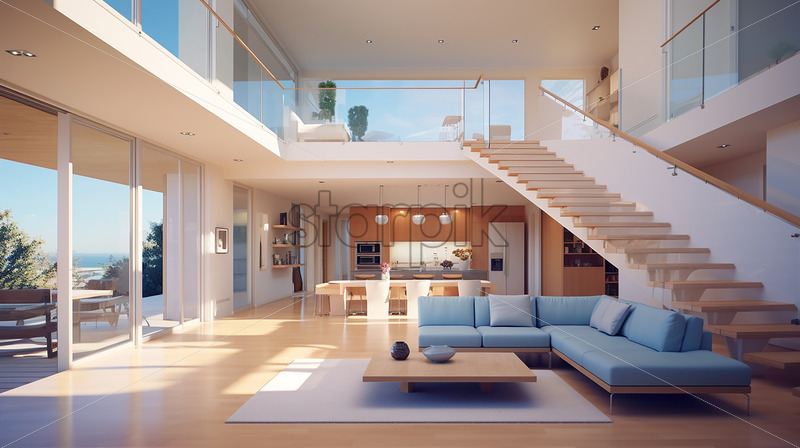 Modern house in the city with wooden stair cozy couch, dining, kitchen and veranda with a relaxing view
