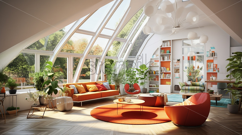 Home » Shop » Uncategorised » Modern house in the country side, clear glass wall and roof with cozy lounge and book shelves an elegant ambience with white theme and indoor plants