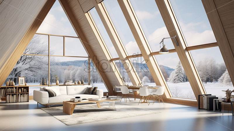 Modern house in the country side, clear glass wall with cozy couch, office table and minimalist book shelves in a minimalist