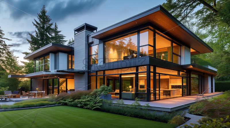 Modern house with warm lighting at dusk, floor-to-ceiling windows, and beautiful plant landscapes, captured wide-angle.