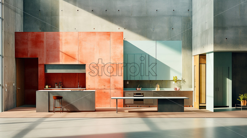 Modern house architecture in the city with clear glass wall in front of the dining table and kitchen with cinematic ambience and veranda overlooking in the city