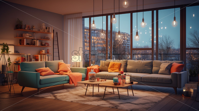 Modern house in the country side, clear glass wall with big couch and minimalist book shelves in a cinematic theme