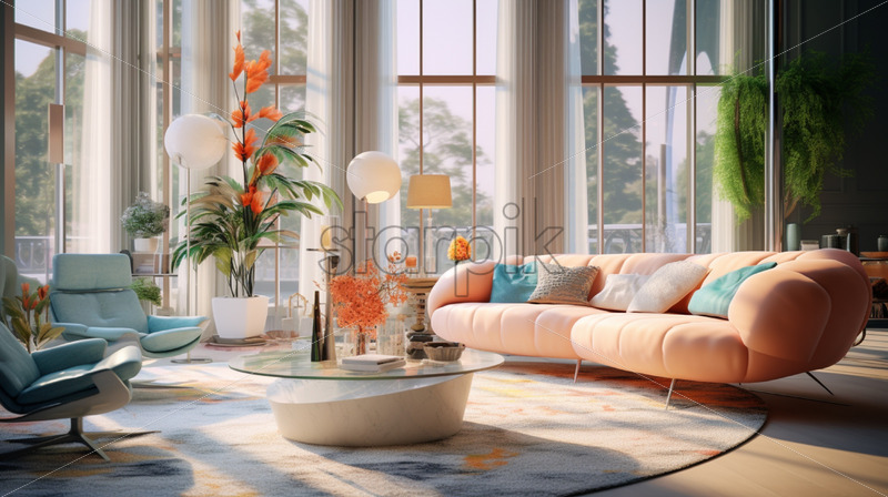 Classic and elegant house in the country side with indoor plants and a classy stair, classy couch and vintage furniture