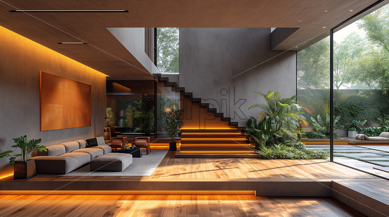 An indoor photograph capturing the modern charm of a living room featuring a gray sofa set, a plant in a vase, wooden chair, warm lighting, and plants beside the stair base, complemented by glass panels, bathed in the morning sunlight with concrete walls and hardwood floors, within a 2-story layout surrounded by concrete pathways, tall fences, and trees in the background