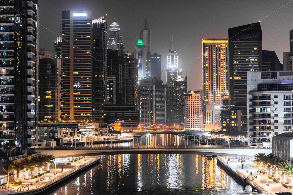 Home » Shop » photo » Modern looking view in Dubai at night, United Arab Emirates. Bright lights with orange predominance on the building