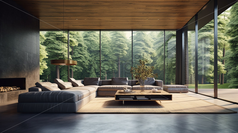 Home » Shop » Uncategorised » Modern lounge in the country side and clear glass wall with indoor plants and wood heating for winter