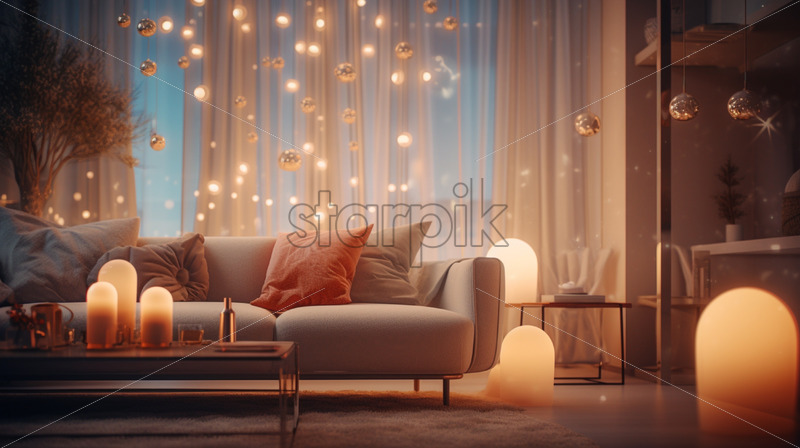 Modern house in the country side, clear glass wall with cozy couch, office table and minimalist book shelves in a minimalist
