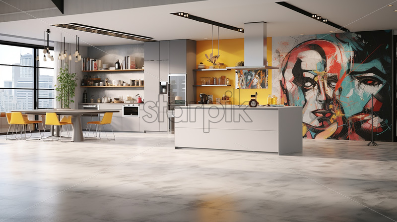 Modern spacious house architecture in the city with clear glass wall in the kitchen and dining table with bright ambience in a gray and yellow theme with modern couch and indoor hanging plants