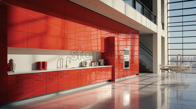 Home » Shop » Uncategorised » Modern spacious house architecture in the city with clear glass wall in the kitchen in a red and white theme and white dining table with bright ambience in a gray and yellow theme