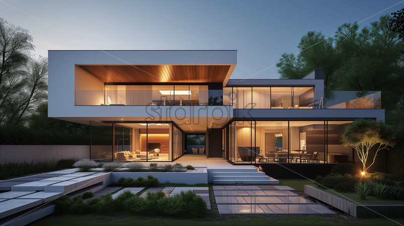 A photograph capturing the aesthetic allure of a modern two-bedroom, two-story house with expansive glass wall panels, warm interior lighting, white exterior painting, a family-sized diner, and a simple garden adorned with white marble pathways and mid-tall fences, set against a backdrop of trees and clear skies during dusk time.