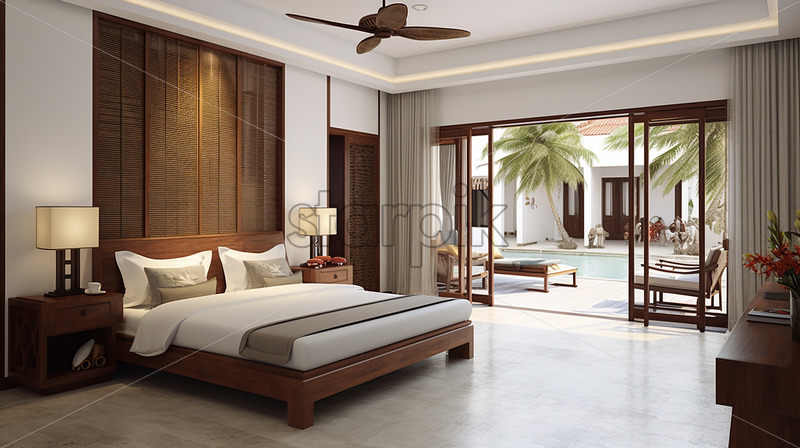 Modern vacation house in a beach side a wooden bedroom with balcony, clear glass sliding door, swimming pool and a classy bedframe