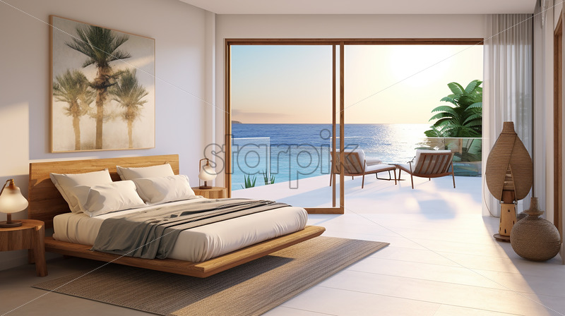 Home » Shop » Uncategorised » Modern vacation house in a beach side a wooden bedroom with balcony, rattan accessories and classy bedframe