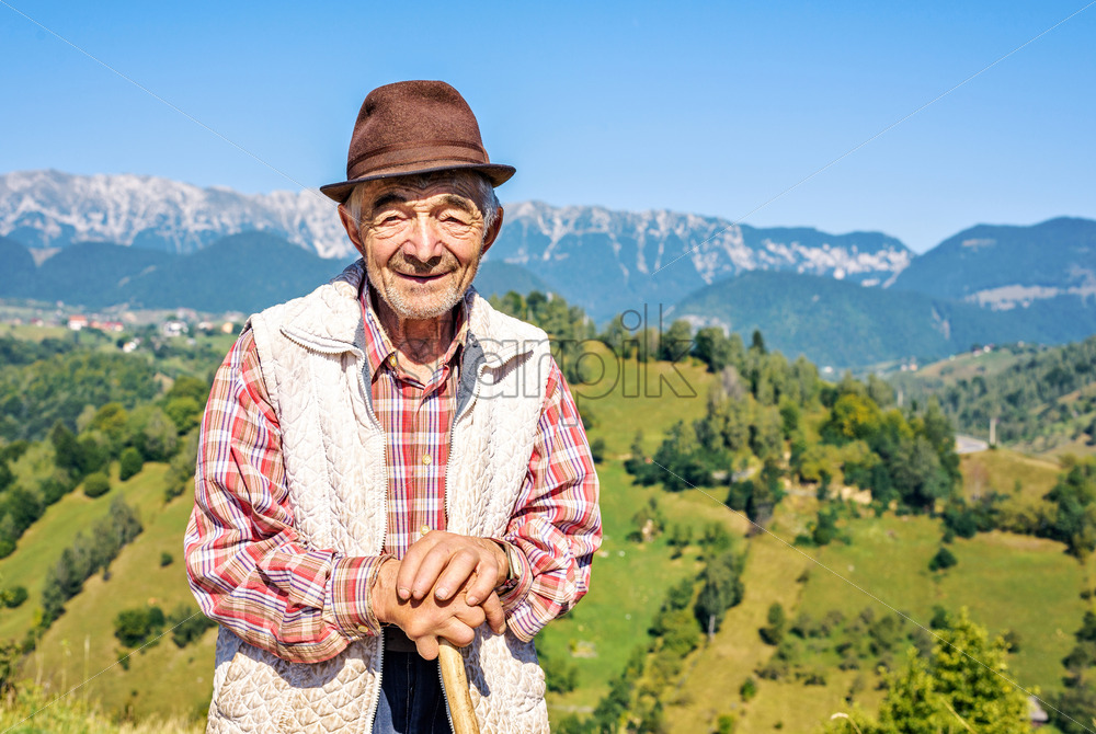 Home » Shop » photo » MOIECIU, ROMANIA – AUGUST 31, 2017: Daylight view to old Shepherd on beautiful picturesque landscape background with mountains. Negative copy space, place for text. Bright blue clear sky
