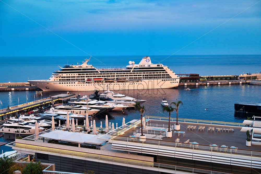 MONACO – AUGUST 21, 2023: View of the sea port with moored yachts and a ship at sunset