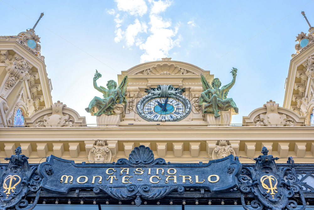 MONACO, FRANCE – JUNE 28, 2017: View from bottom to Monte-Carlo Casino facade with classic ornaments. Bright blue sky with clouds on background.