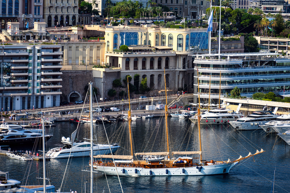 Monaco Monte Carlo buildings and port in summer, sea and mountains