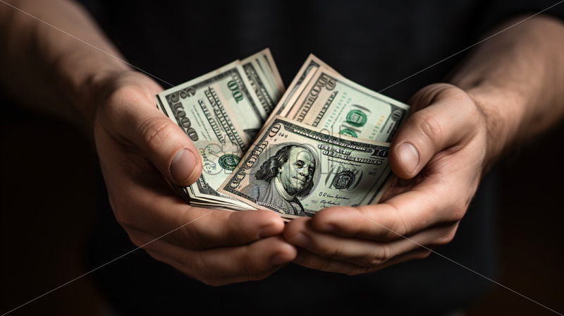 Woman dropping a banknotes into a jar with rolled banknotes on the table. Papers, money on the table