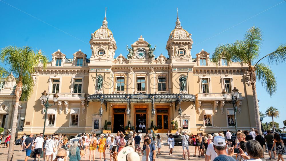 MONACO – AUGUST 8, 2021: Monte-Carlo Casino entrance, security, greenery and multiple people in front of it