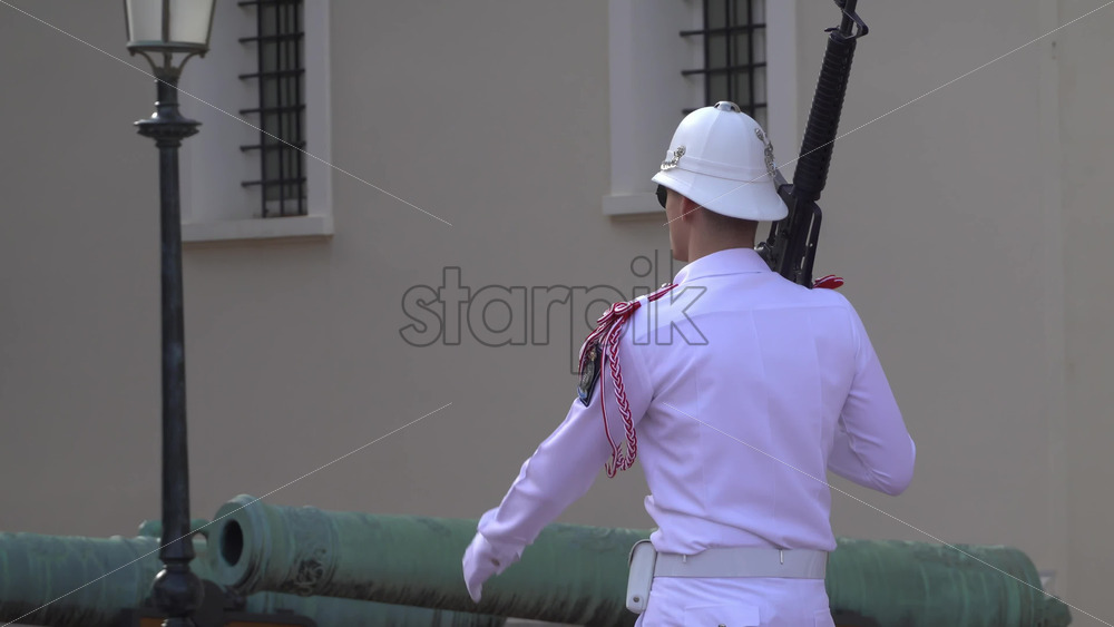 Monte Carlo, Monaco – July 4, 2025: Guard dressed in white marching at the Palace of Monaco in daylight Royalty Free Stock Video Footage