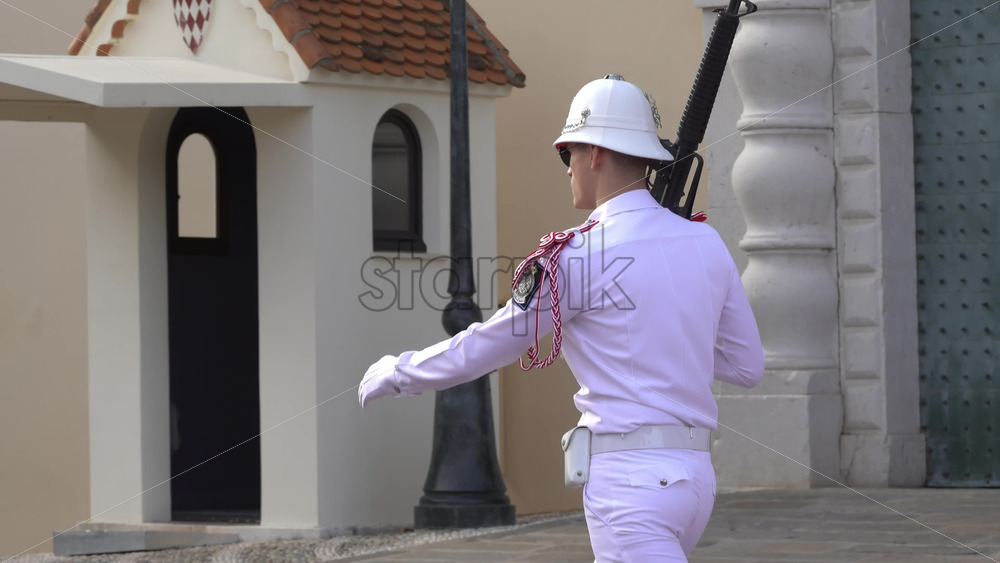 Home » Shop » 1 Video » Video – Monte Carlo, Monaco – July 4, 2025: Guard dressed in white marching at the Palace of Monaco in daylight