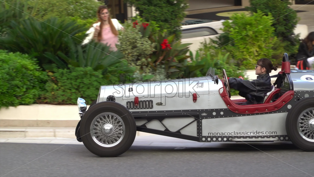 Monte Carlo, Monaco – July 4, 2025: Side view of a woman driving a retro-style silver sports car from Monaco Classic Rides through the courtyard of the Monte Carlo Casino Royalty Free Stock Video Footage