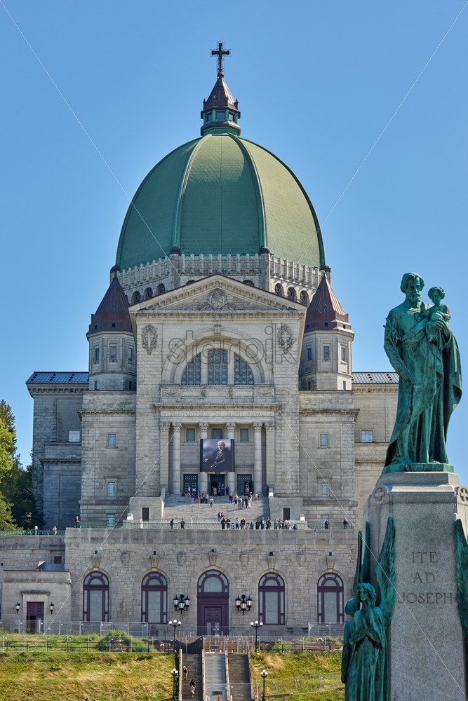 MONTREAL, CANADA – SEPTEMBER 13, 2019: Wide shot of Ite ad Joseph monument made of bronze and Saint Joseph Oratory in the background. The weather is clear and sunny