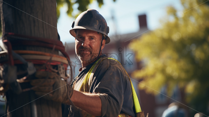 Wearing PPE, an electrician meets the camera with hands on a wire post, morning sunlight gracing trees in the blurred background, reflecting focus and professionalism