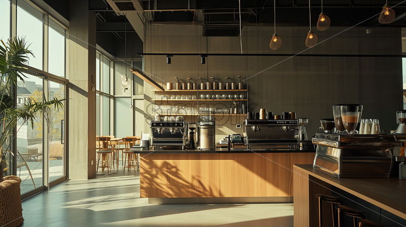Early morning at a modern coffee shop, bathed in soft natural light, captured overhead, emphasizing clean lines.