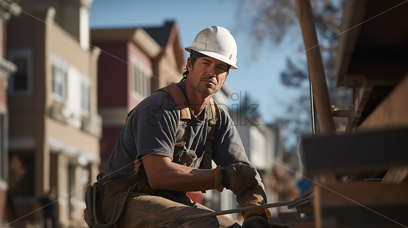 In morning sunlight, an electrician in PPE, on his knees, adjusts his sleeve while looking towards the camera, reflecting dedication and attention to detail.