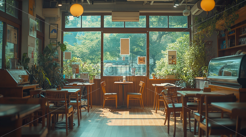 A delightful photo taken from inside a coffee shop during the morning, exuding warm ambiance with wooden chairs and tables, captured in a charming retro style, creating a nostalgic and inviting atmosphere.