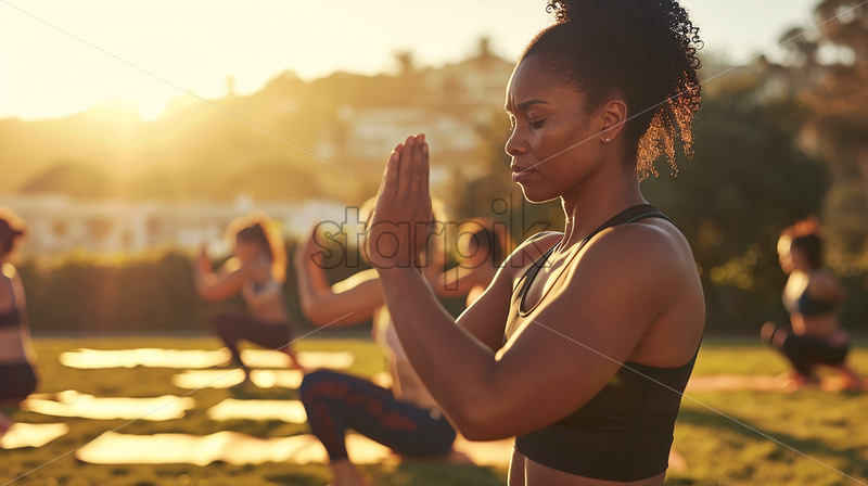 A black woman, eyes closed, maintains a slightly serious expression in a morning yoga session with others, captured in a side profile from waist to top.