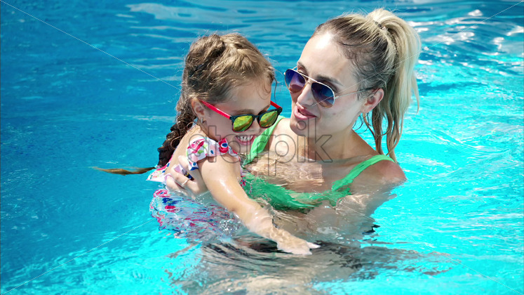 Mother and daughter resting and swimming in a pool in summer Royalty Free Stock Video Footage