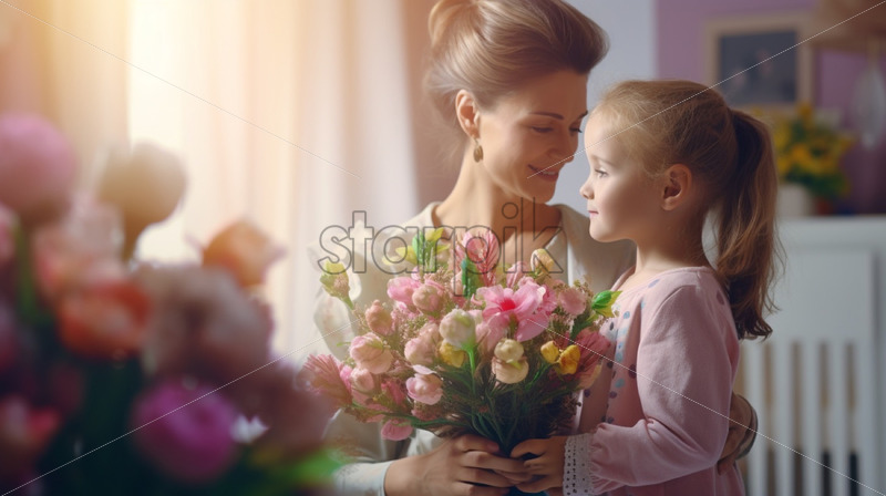 Mother and son with a delicate floral bouquet representing mother day