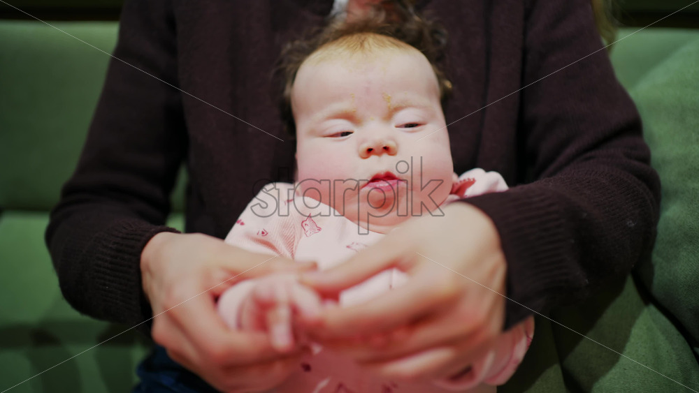 Close up of a baby while an adult gently supports them during a home care routine