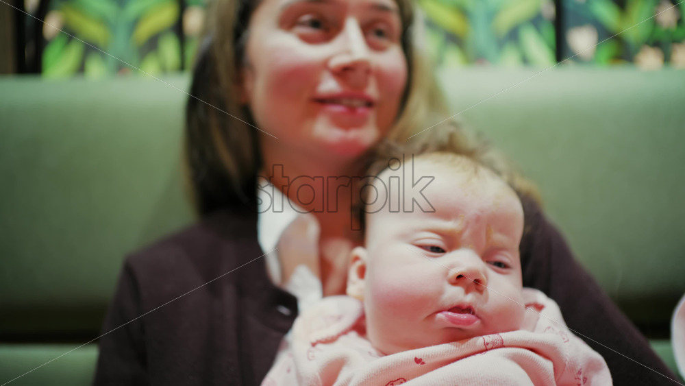Mother sitting on a sofa while gently holding and looking at her newborn baby