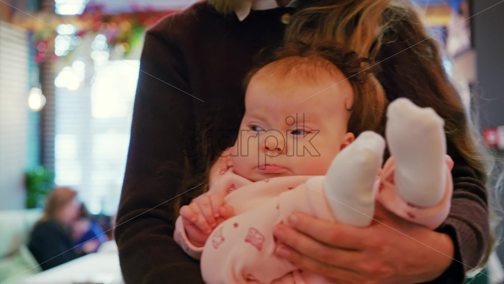 Mother holding a baby in her arms inside a restaurant