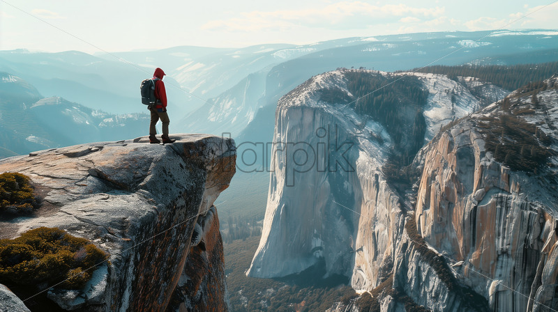A close-up photo of a hiker finding solitude and peace amidst towering mountains.