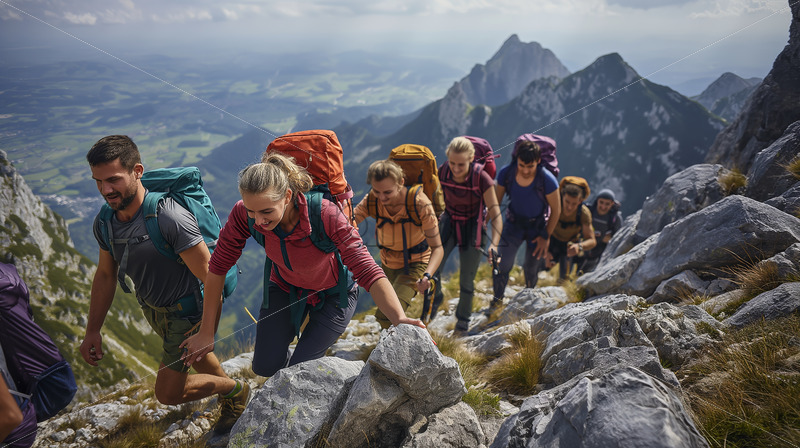 Group of friends conquers rugged mountain trail, faces flushed with exertion and triumph.