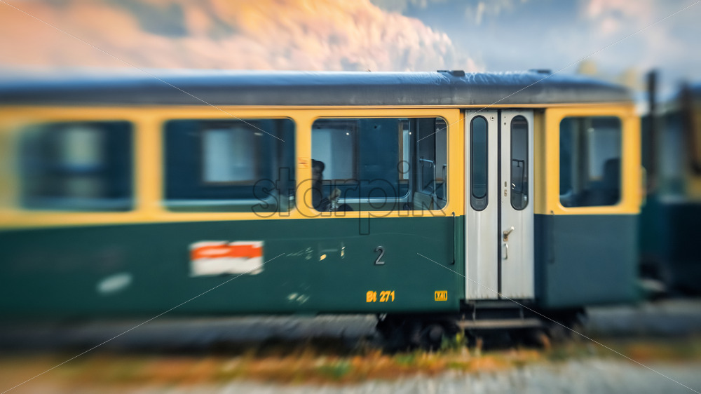 Moving steam train Mocanita with passengers inside, Romania. Lensbaby effect