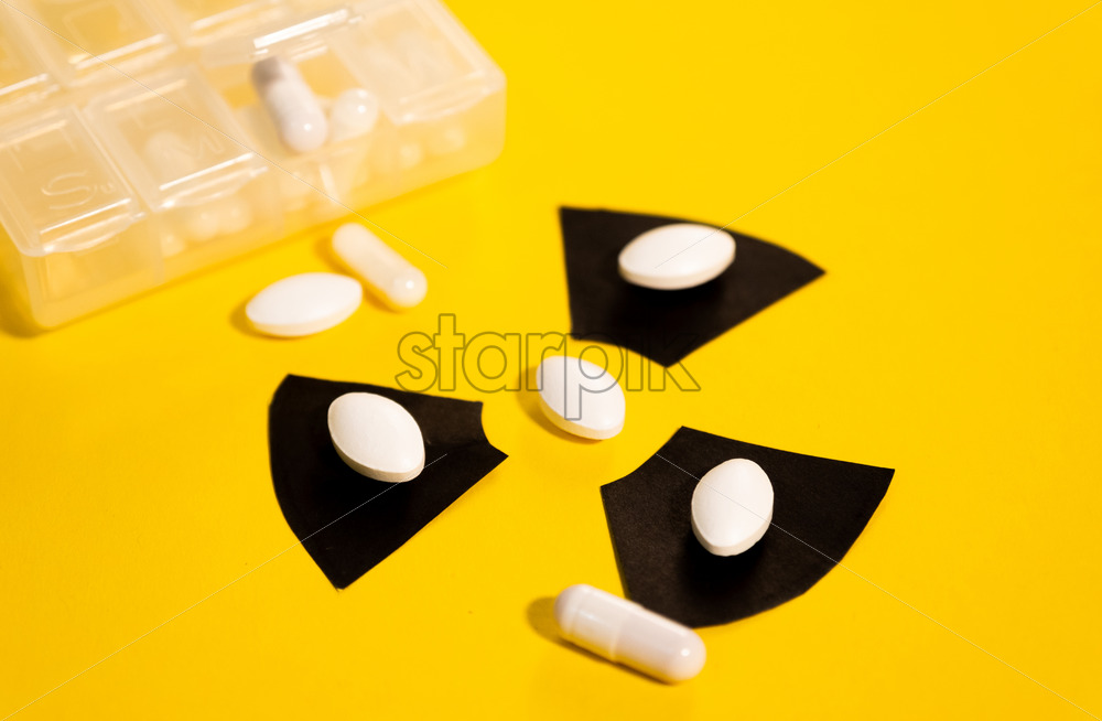 Multiple anti-radiation pills based on iodine on a yellow background and the radiation warning sign