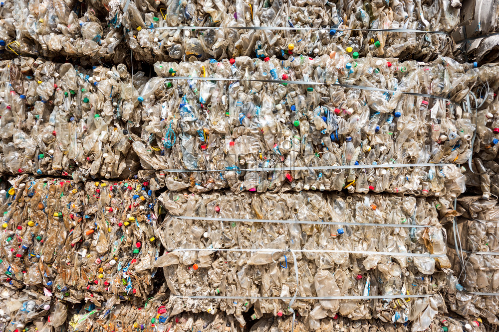 Multiple cubes of compressed plastic garbage near the waste recycling factory in open air
