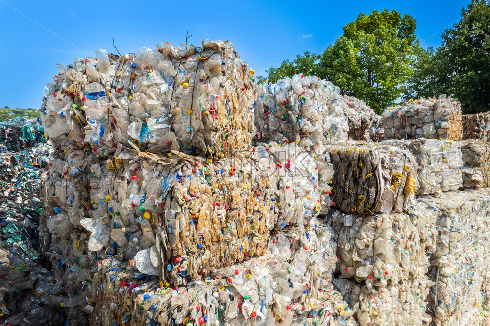 Multiple cubes of compressed plastic garbage near the waste recycling factory in open air