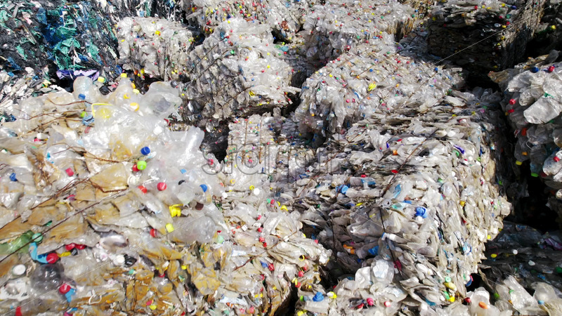 Multiple cubes of compressed transparent plastic garbage at waste recycling factory in open air Royalty Free Stock Video Footage