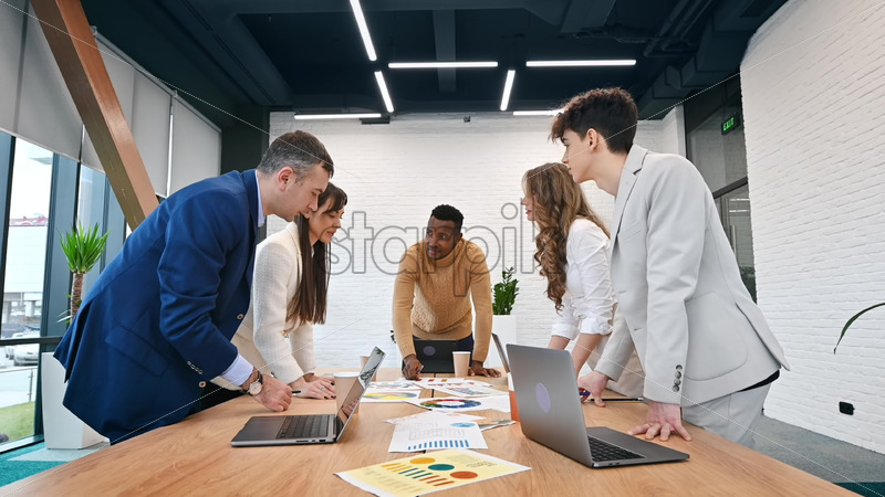 Multiracial group of people at business meeting in an office, discussing business affairs with each other using papers and gadgets on the table Royalty Free Stock Video Footage