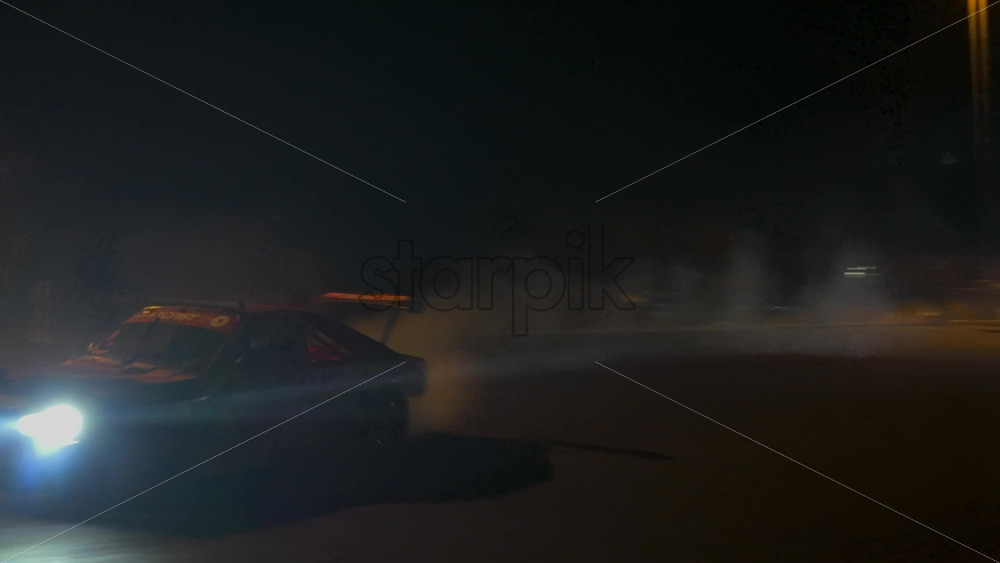 Mures, Romania – July 19, 2025: A fast sports car performing a drift in an open lot illuminated by bright streetlights on a rainy night at the RoDrift competition Royalty Free Stock Video Footage