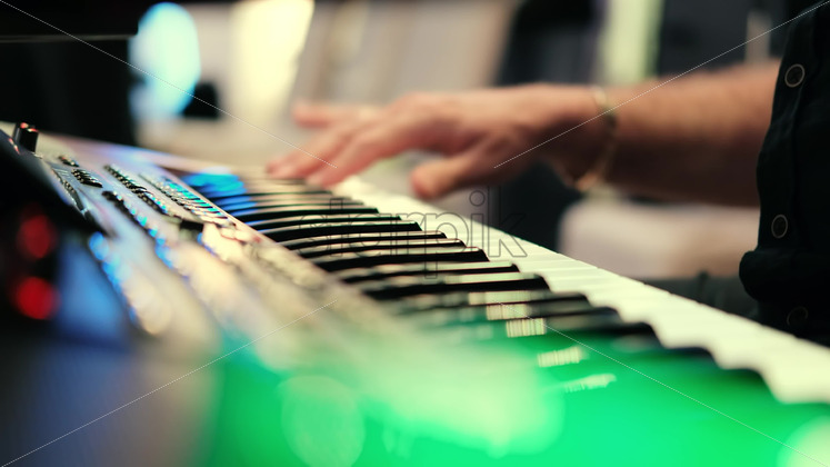 Musician artist man playing colored piano music wedding party, close up bokeh lights Royalty Free Stock Video Footage
