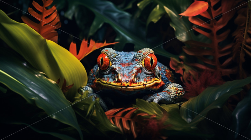 Home » Shop » Uncategorised » Mysterious and rare jungle amphibians with vibrant patterns, camouflaged among tropical leaves