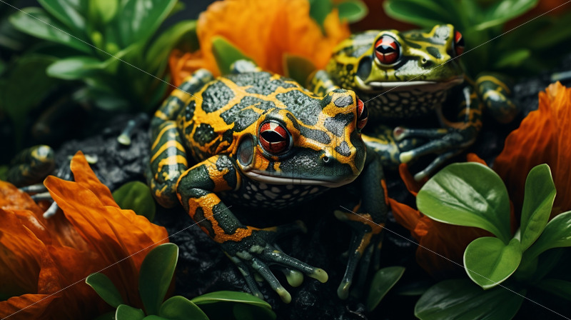 Home » Shop » Uncategorised » Mysterious and rare jungle amphibians with vibrant patterns, camouflaged among tropical leaves